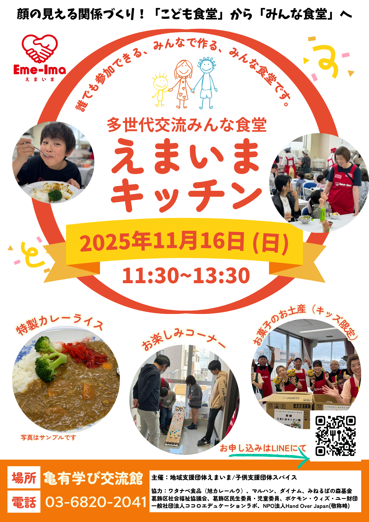 毎月第3日曜日に開催する多世代交流みんな食堂えまいまキッチンのお知らせです。